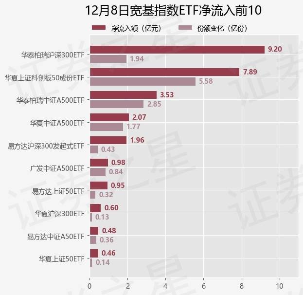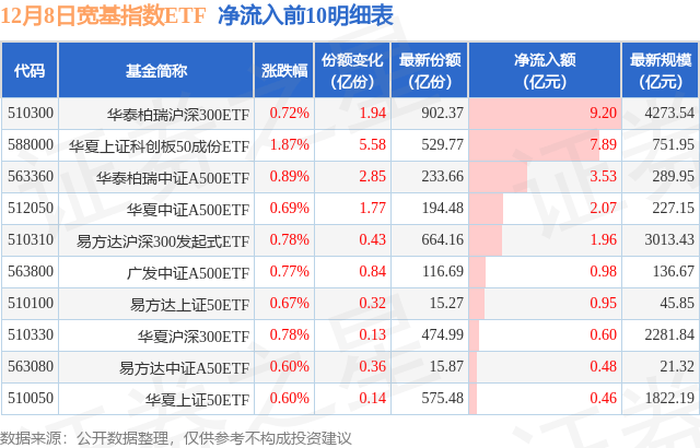 当日有39只宽基指数ETF基金出现资金净流入,其中净流入排首位的是华泰柏瑞沪深300ETF(510300),份额增加了1.94亿份,净流入额为9.2亿元。