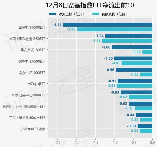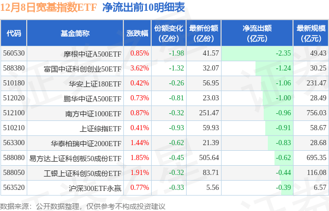 当日有67只宽基指数ETF基金出现资金净流出,其中净流出排首位的是摩根中证A500ETF(560530),份额减少了1.98亿份,净流出额为2.35亿元。