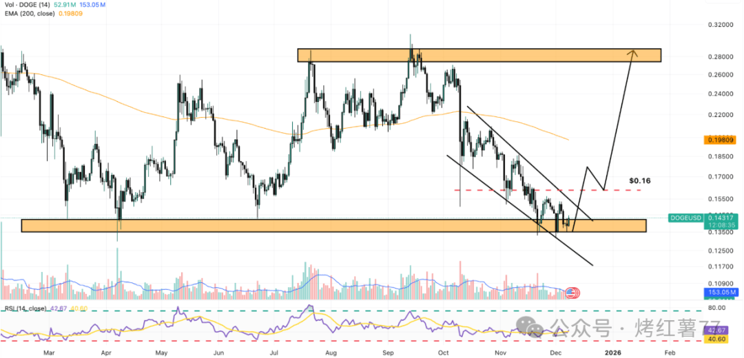 若 DOGE 能坚守 0.14 美元支撑并进一步突破 0.16 美元阻力,则有望确认短期趋势反转,打破近期下跌结构。突破后,首个目标可看至 200 日指数移动平均线(EMA)附近,该位置通常伴随较强技术意义与成交密度。