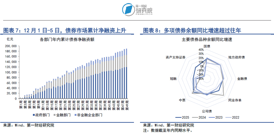 从债券余额增速来看,今年多项债券余额同比增速超过往年同期。截至12月5日,政府部门债券余额同比增速为17%,较2024年同期增速上升0.6个百分点;金融部门债券余额同比增速为9.4%,较2024年同期增速下降3.8个百分点;非金融企业部门债券余额同比增速为7.6%,较2024年同期增速上升3个百分点。
