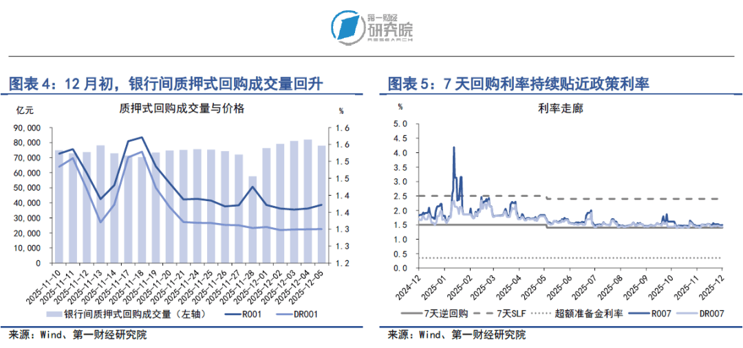 在12月1日至12月5日当周,月初银行间市场资金面边际放松。从成交量来看,上周银行间市场质押式回购成交量均值为7.93万亿元,较前一周下降8350亿元。