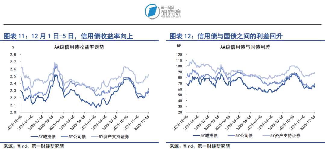 在12月1日至12月5日当周,多数品种信用债收益率上升。在AAA级债券中,5年期城投债、公司债和资产支持证券的收益率分别上升4.66BP、2.96BP和2.63BP。在AA级债券中,5年期城投债、公司债和资产支持证券收益率分别上升3.67BP、4.9BP和2.09BP。