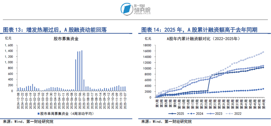 在12月1至12月5日当周,A股融资总额为128.39亿元,较前一周下降30.24亿元。年内,A股累计融资额超1.03万亿元,高于往年同期。值得注意的是,目前A股融资主要集中于增发和可转债,IPO融资额年内累计为1164.68亿元,占总融资的比重为11.3%。