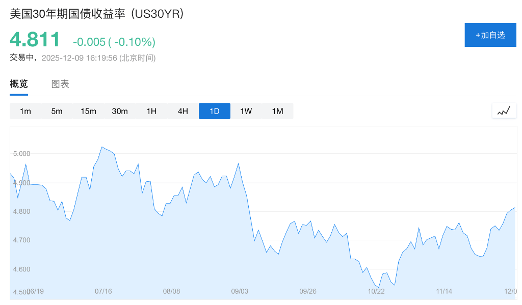市场焦点在于本周美联储利率决议,美股指期货集体上扬,美国债券收益率上行。美国10年期国债收益率周二升至4.182%,30年期收益率一度逼近4.82%,均创9月以来新高。