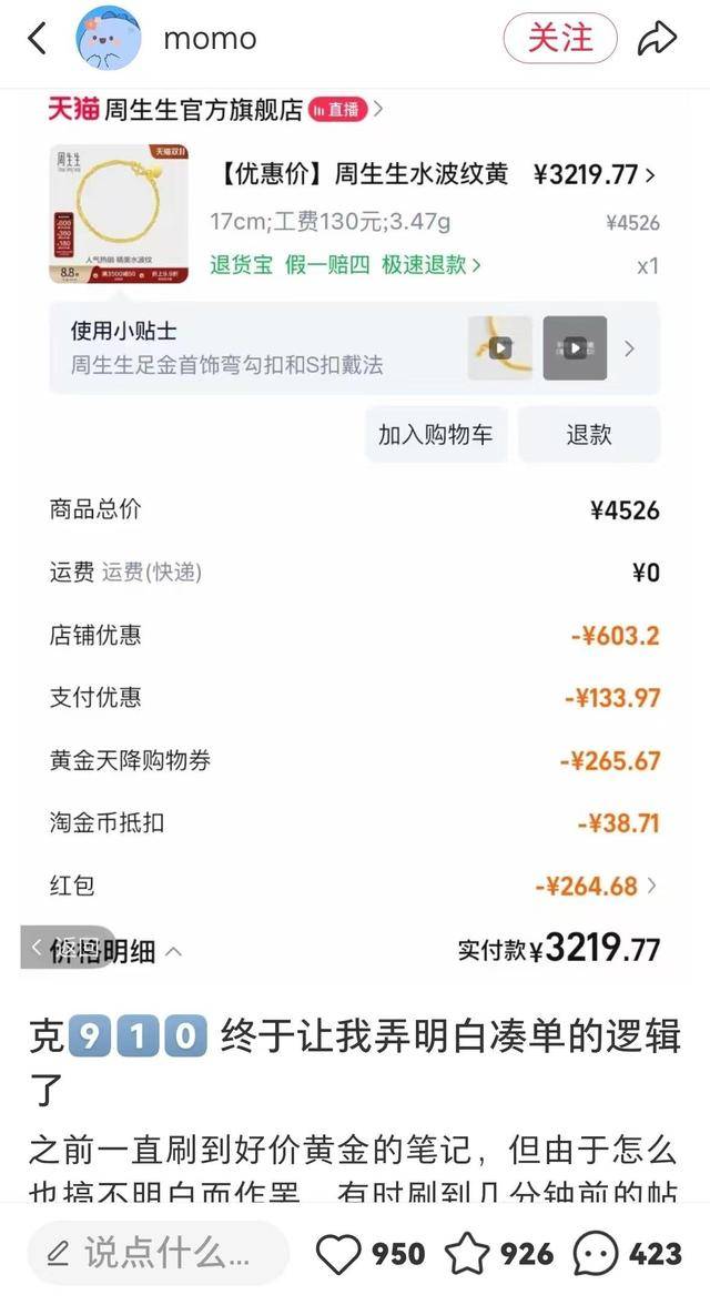 “直播间88折、外加信用卡、黄金天降券、淘金币等分摊的优惠,克价到了910元,太开心了”北京消费者momo在小红书分享大盘金价1310元时,如何抢到910元克重的周生生金饰的攻略。帖子的“爆火”折射渠道变革趋势。