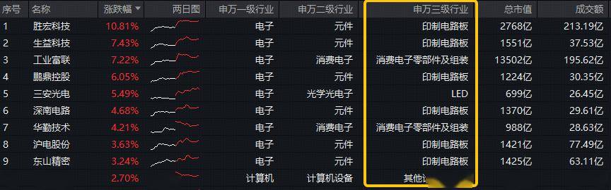 成份股方面,印制电路板(PCB)方向显著领涨,电子ETF标的指数涨幅前10大成份股中,PCB概念股占据6席,其中,胜宏科技领涨超10%,生益科技涨逾7%,鹏鼎控股涨逾6%。此外,消费电子龙头工业富联涨超7%,AI芯片龙头寒武纪上涨1.28%,股价再度超越贵州茅台,位居A股第一。