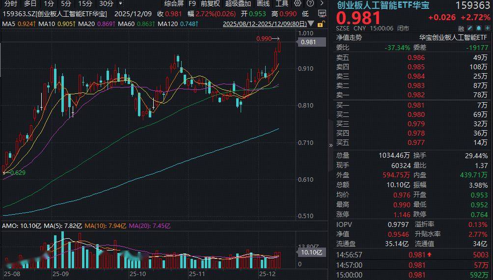 同类对比看,截至12月8日,创业板人工智能ETF华宝(159363)最新规模超33亿元,近1个月日均成交额超6亿元,在跟踪创业板人工智能指数的7只ETF中排行第一!