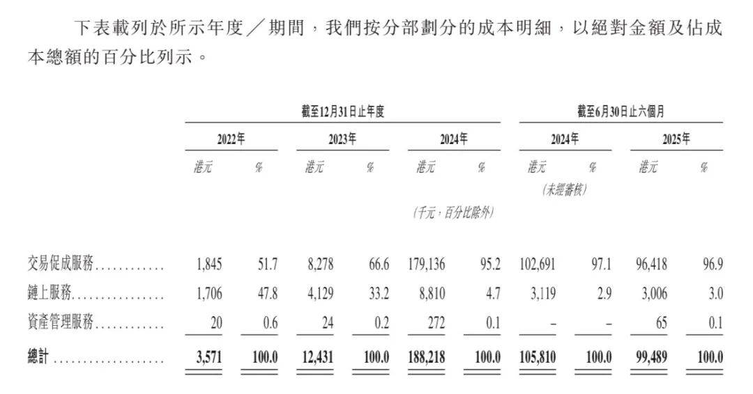交易促成服务是公司最主要的收入来源,这项业务是为客户提供合规的数字资产交易服务。截至2025年9月30日,公司数字资产交易所累计促进现货交易量达1.3万亿港元。公司交易量从2022年的42亿港元大幅增加至2023年的3280亿港元,2024年进一步增至6384亿港元。