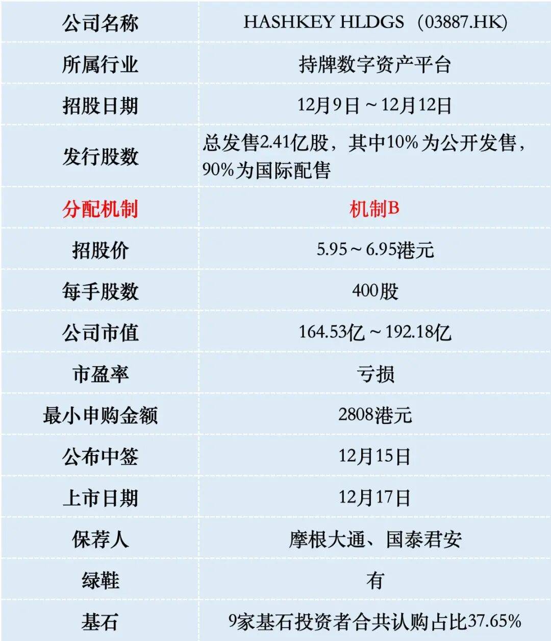 HASHKEY本次IPO发行股份占全部股份比例的8.7%,按招股价上限6.95港元算,募资16.7亿,9名基石投资者锁定5.8亿,流通盘10.9亿。
