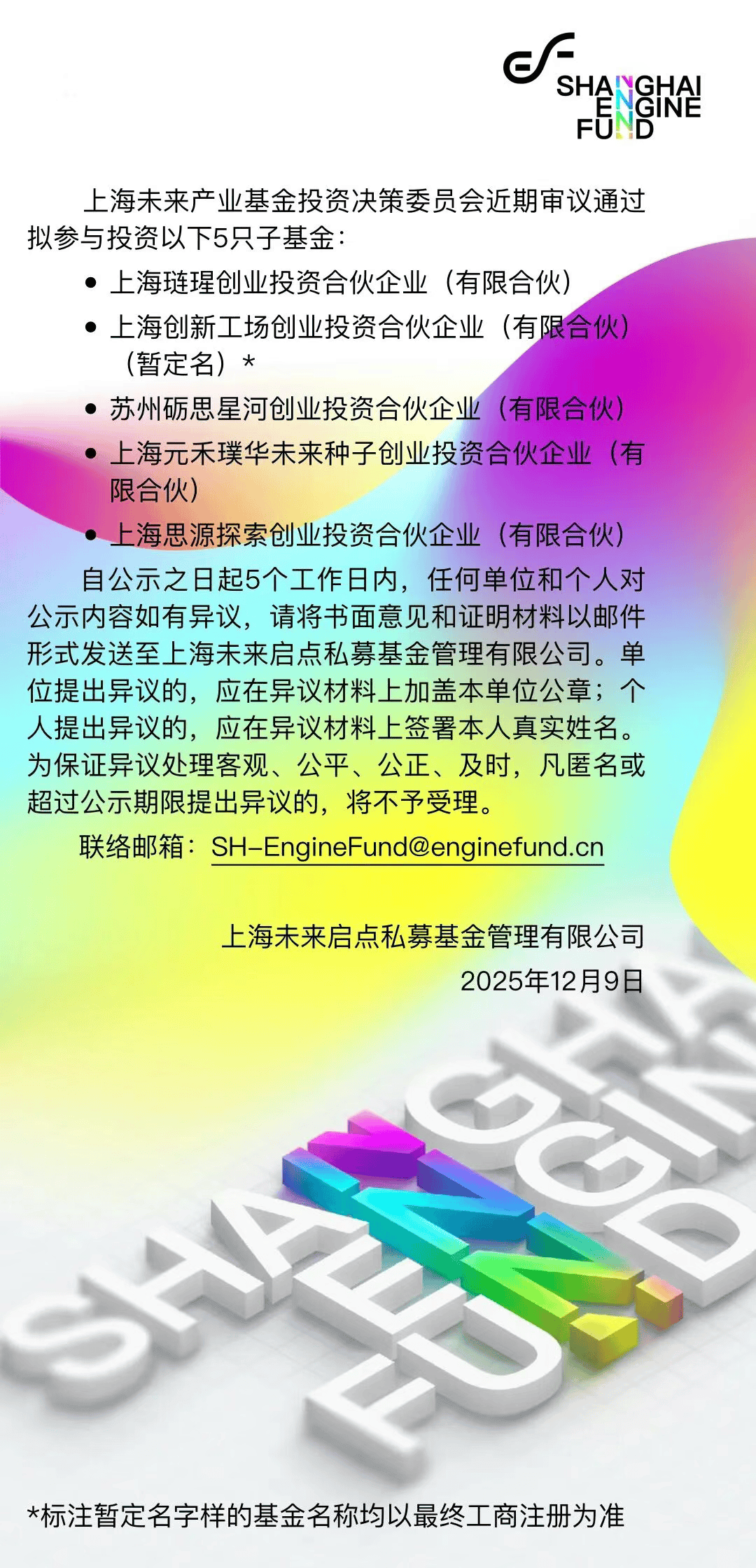 投资界12月9日消息,上海未来产业基金发布公告,投资决策委员会近期审议通过拟参与投资以下5只子基金: